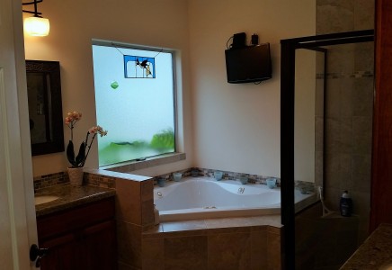 The large master bedroom features dual walk-in closets with extra shelving. The huge master bath includes a Jacuzzi tub, large tile shower, private glass window, and a separate water closet. The glass window lets in an abundance of natural light, which really makes this master bath something special.